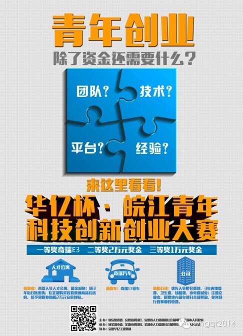 本報訊 以“匯聚科技人才,實現創業夢想”為主題的皖江青年科技創新創業大賽已經拉開大幕,目前開始接受報名,9月30日報名截止,9-11月份舉行初賽、復賽和決賽。一等獎將獲奇瑞E3轎車一輛,二三等獎分別獲得人民幣2萬元和1萬元獎勵。此外,有關部門將對落戶蕪湖創業的獲獎團隊,給予以“房、車、公司”為標志的一系列獎勵和扶持舉措。